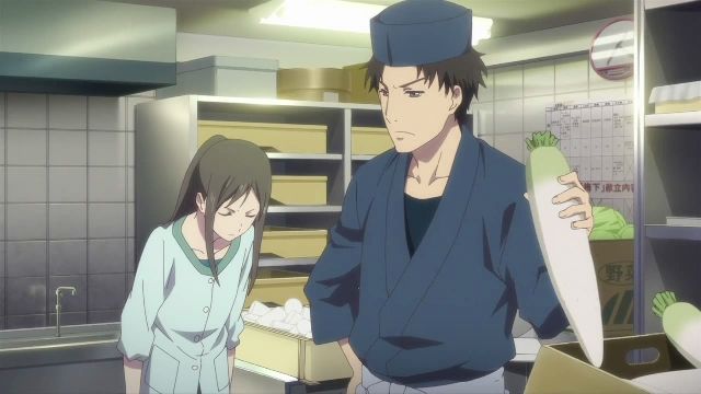 厨房を覗きに言ったら、大根の「かつらむき」の皮が厚いとセンパイの板前から怒られている「氏ね」と言われた民子がいました。ちょっと、キツイんちゃうやろか?