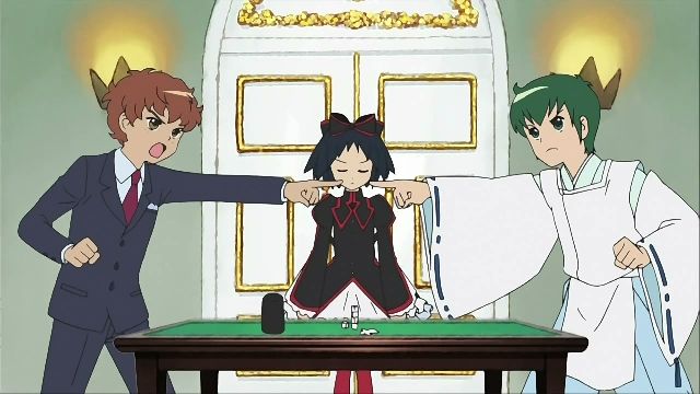 東海寺阿修羅(緑髪)くんが、霊が見えるとか言うと麻倉良太郎(茶髪)くんが噛みつきケンカになる図式。いつものことらしいのですが今回、そのジャッジに選ばれたのはチョコちゃん。