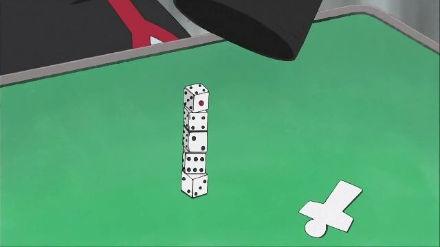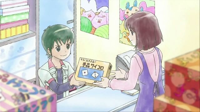 試しにチョコちゃんがやってみると見事成功。実は種明かしがあって、サイコロには磁石が組み込まれていて、壺の中でかき回すと引っ付く予定でした。しかし、それを阻止すべく良太郎は台の下に振動される装置を取り付けていた。そんな案配。